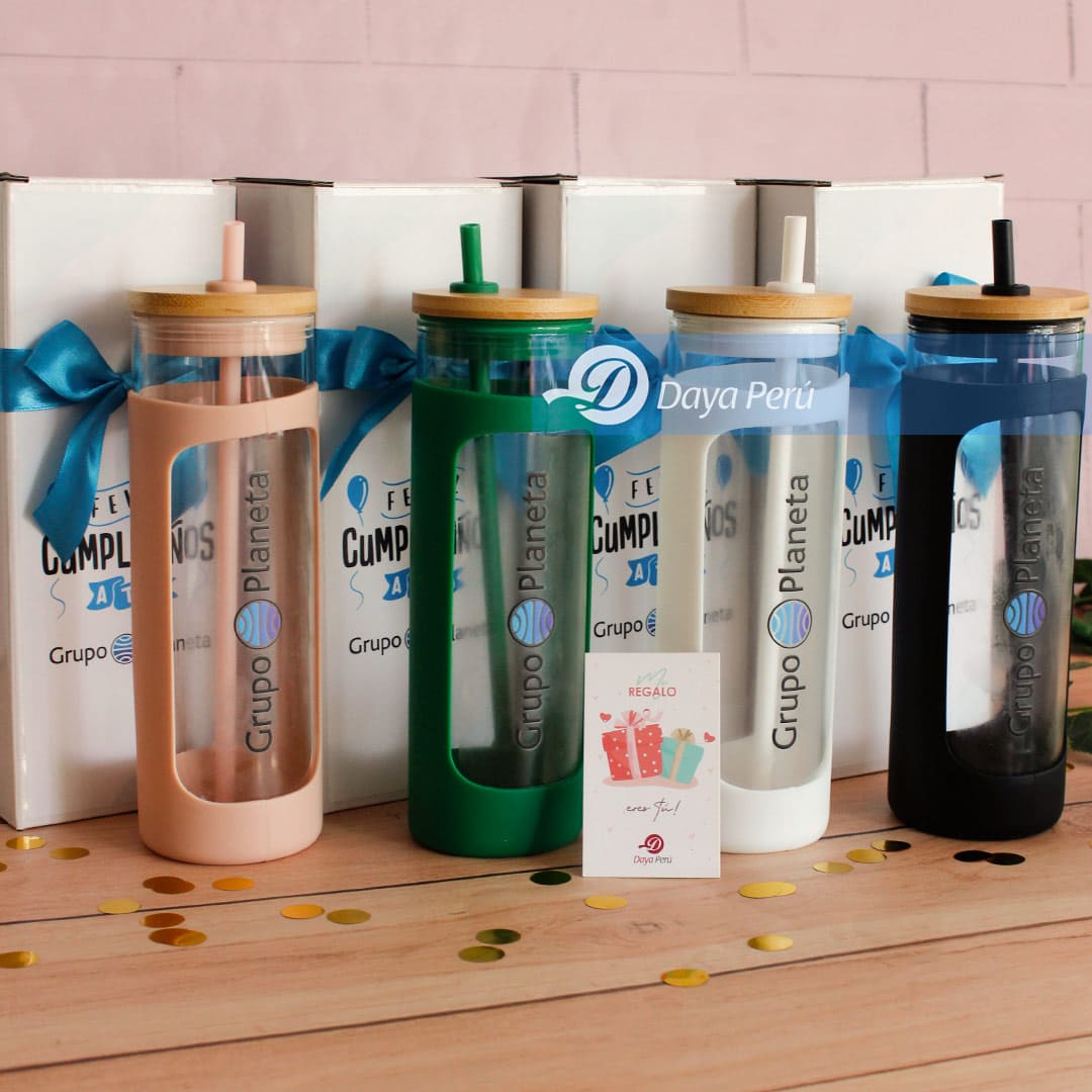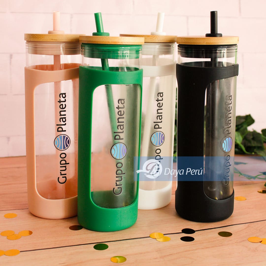 - Tomatodo de vidrio con logo a full color y agarre de silicona + tapa de bambú y sorbete de PVC