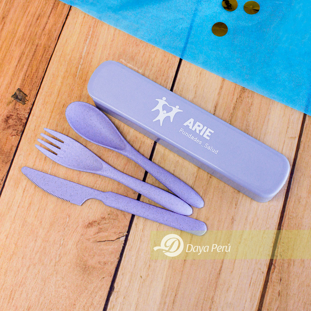 - Set de cubiertos con cuchara, cuchillo y tenedor en estuche con logo a 1 color