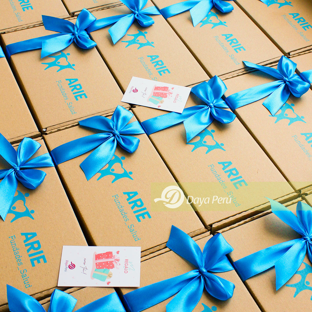 Presentación: Caja eco grabada a 1 color y decorada con lazo de cinta satinada.