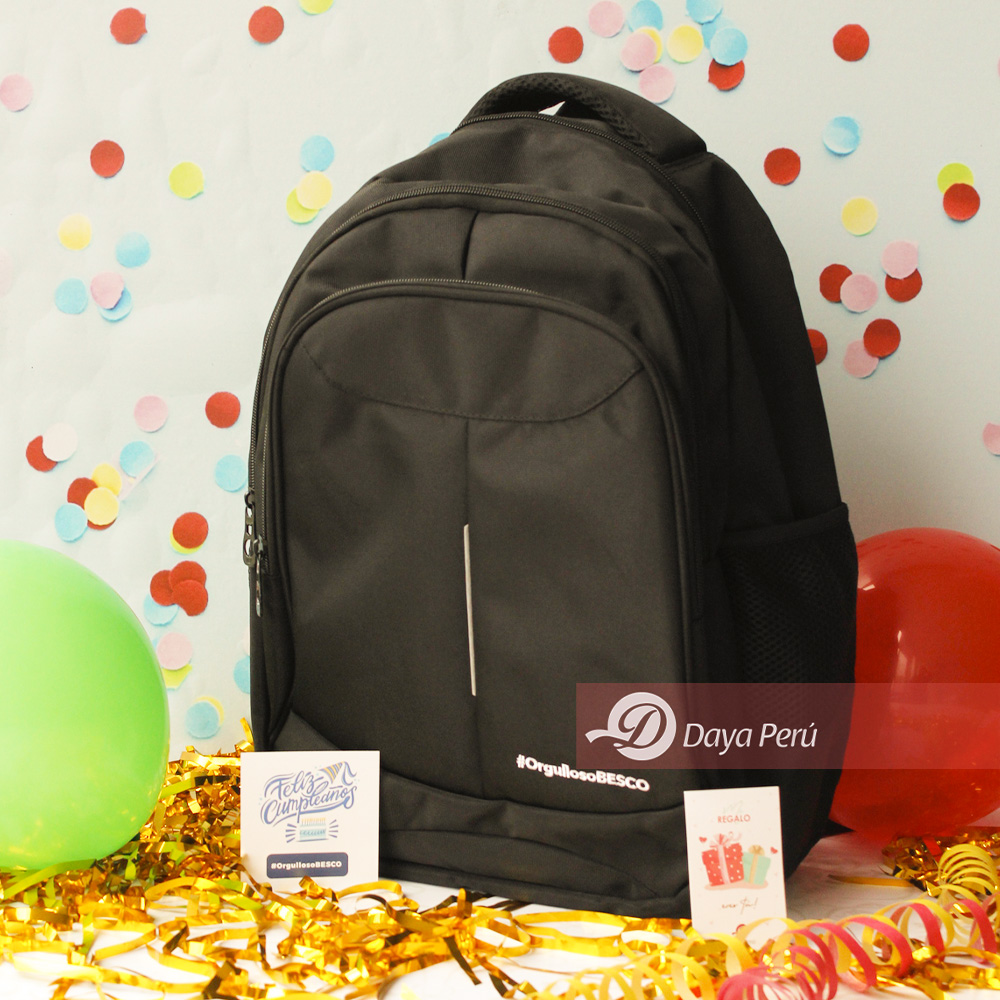 - Mochila negra bordado a 1 color en la parte frontal