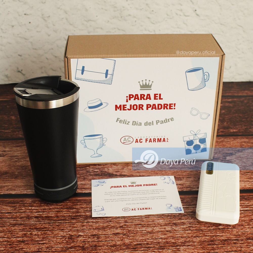 ¡Porque papá no se detiene! Necesita energía y buena música. Este regalo tiene lo que le encanta: un mug con parlante para que disfrute su bebida favorita con ritmo, y un power bank para que su celular siga el ritmo todo el día.