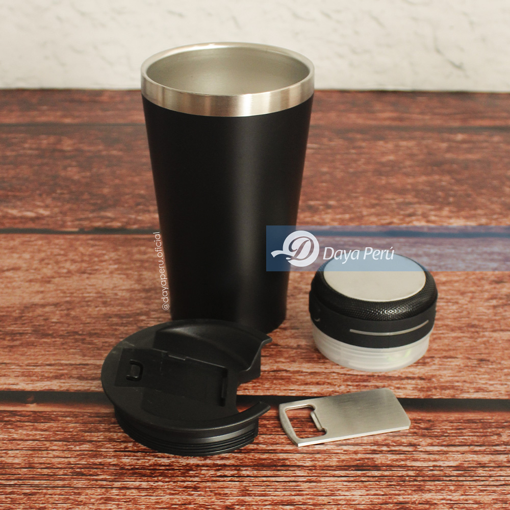 - Mug de metal con destapador y parlante Bluetooth
