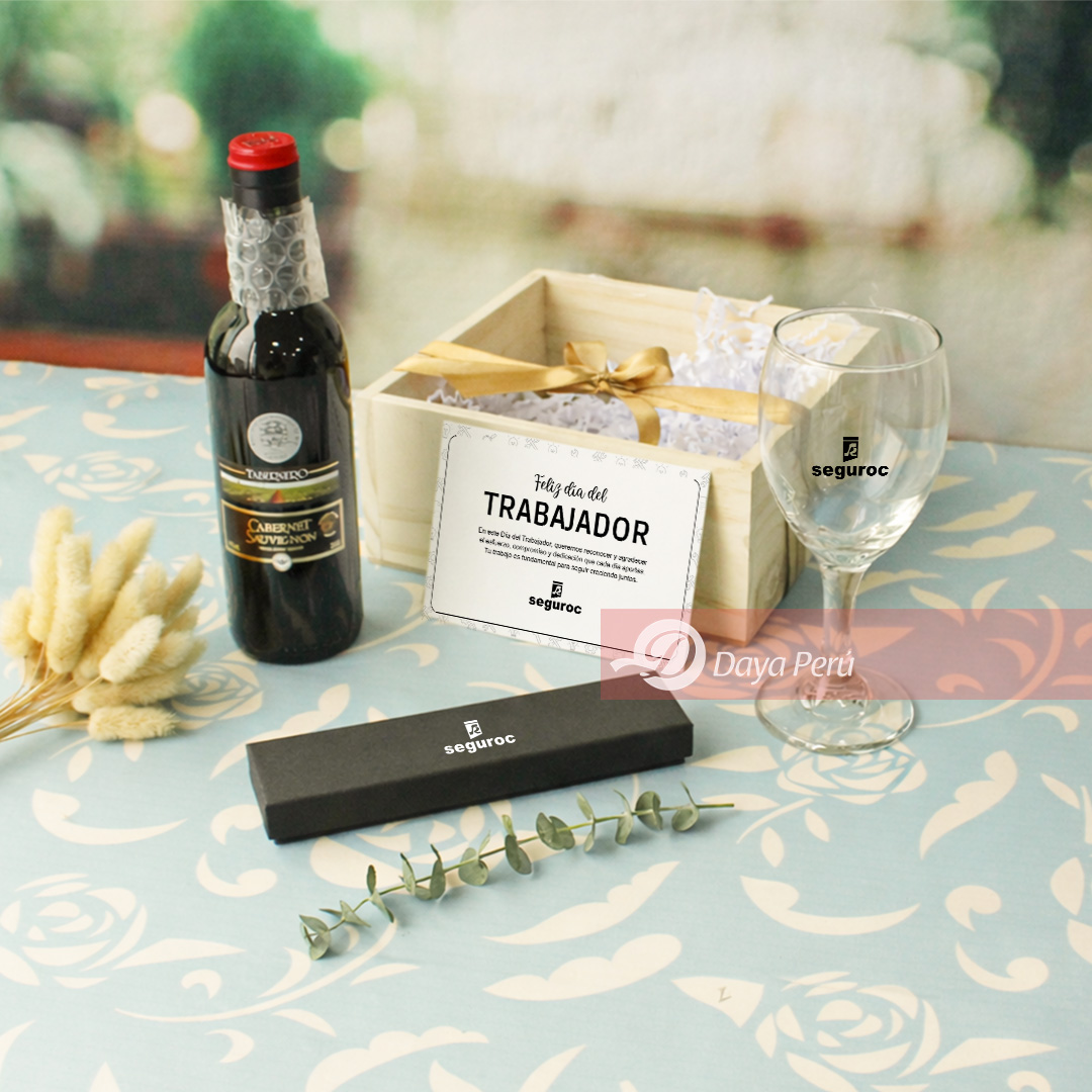 Presentación: Caja de pino decorada con lazo de cinta satinada + tag. Tarjeta personalizada.