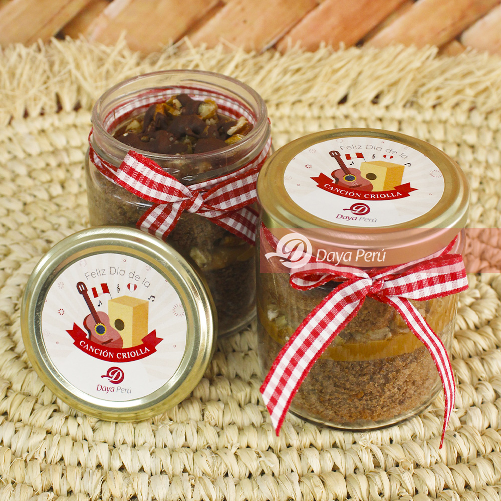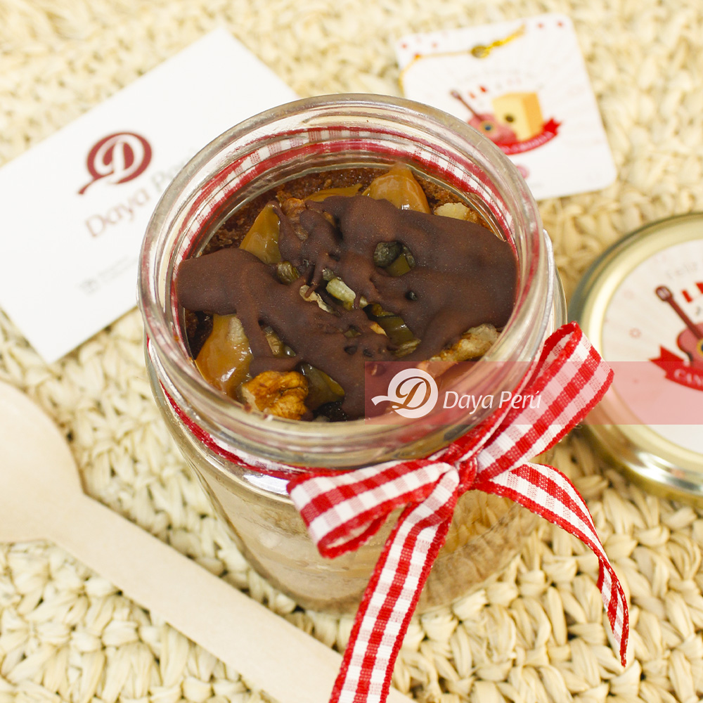 - Jar de vidrio relleno de keke de chocolate con manjar y trozos de pecanas + tapa brandeada y decorado con lazo especial