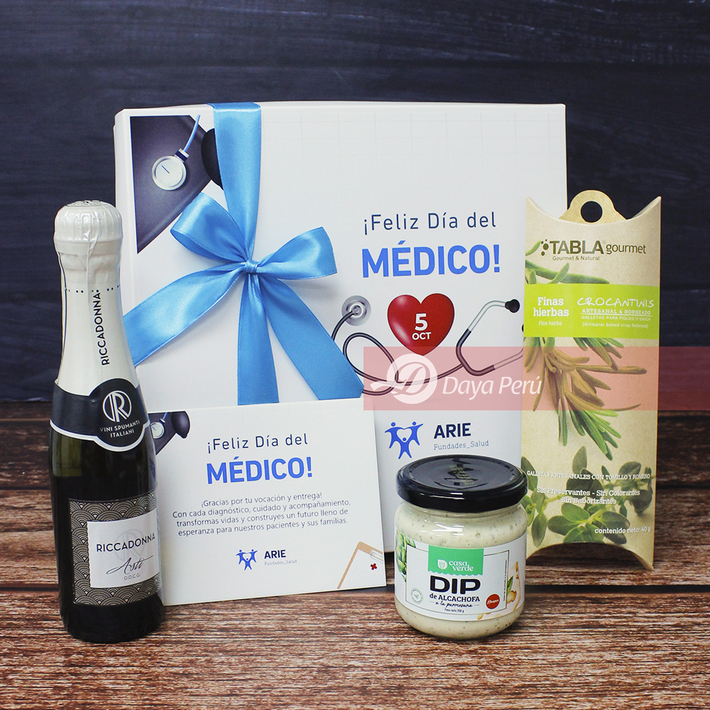 Un presente elegante que combina un espumante acompañado de un dip gourmet y galletas, ideal para rendir homenaje y agradecer la vocación de nuestros médicos.